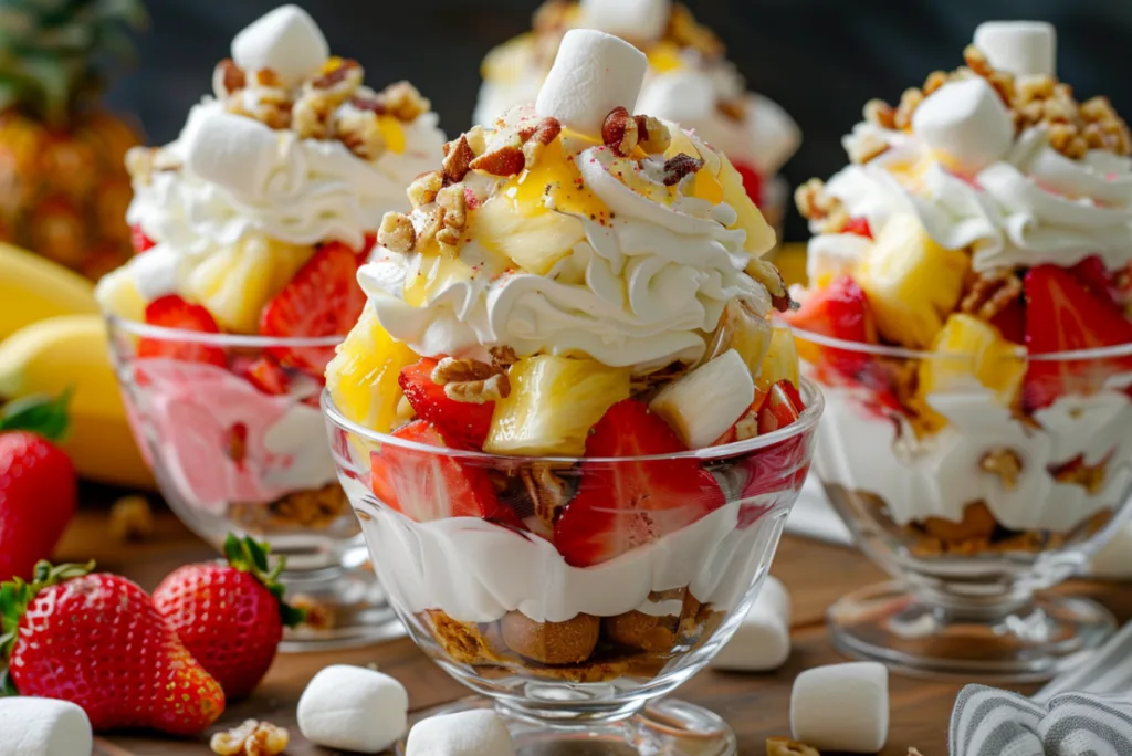 Making Banana Split Fluff Salad is straightforward and quick. The process involves slicing fresh fruits, gently folding them into a creamy blend of whipped cream and vanilla yogurt, and then adding a touch of fun with miniature marshmallows and nuts. This simple yet delightful combination creates layers of flavor and texture that will leave your guests raving about your culinary skills!