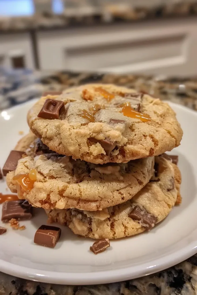 Serve Butterfinger Caramel Crunch Cookies warm with milk or coffee for a cozy treat. They also shine on dessert trays or gift boxes.