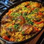 Place the seared chicken thighs back on top of the rice mixture, making sure they’re partly submerged. Bring everything to a gentle simmer. Once the liquid starts bubbling softly, cover the pot with a lid and reduce the heat to low. Let it cook for about 20–25 minutes, or until the rice is tender and the chicken reaches safe doneness.