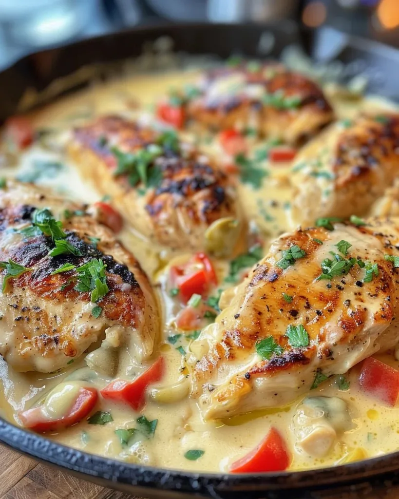 A comforting and flavorful creamy chicken dish enlivened by the tangy zest of pepperoncini, perfect for a weeknight dinner.