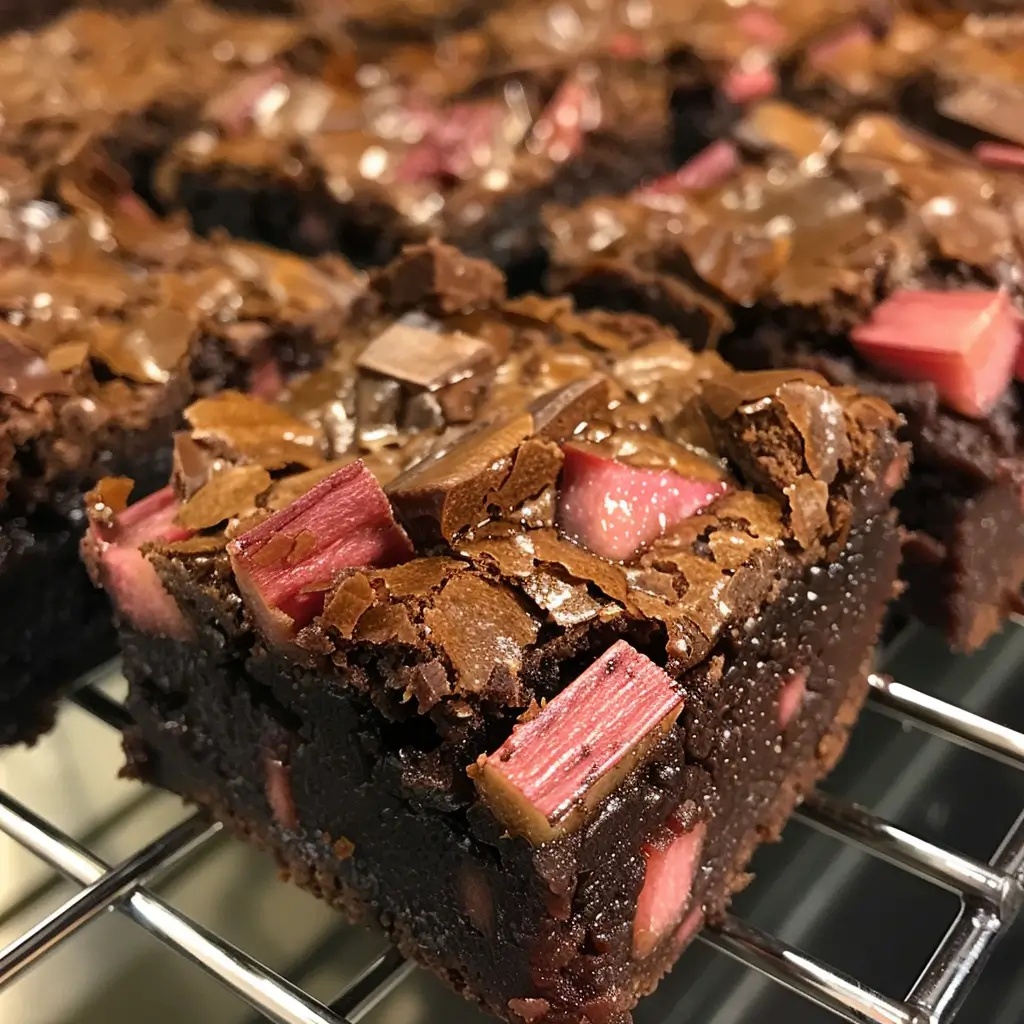 These brownies pair beautifully with hot beverages like coffee, chai, or cocoa, as well as cold options such as milk or iced coffee. They also complement creamy desserts like custard or panna cotta, offering a rich, fudgy contrast. For a sophisticated twist, try serving alongside a berry compote or a light fruit salad—the tang of the rhubarb and berries brightens the chocolate flavor while keeping each bite balanced and flavorful.