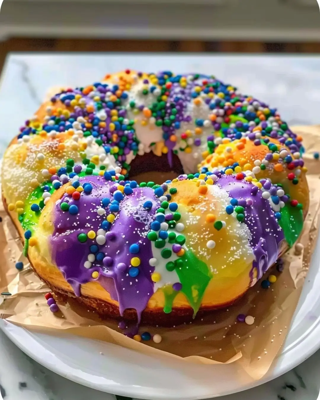The cake is usually a ring-shaped brioche, often filled with cinnamon and decorated in vibrant Mardi Gras colors: purple, green, and gold. A small plastic baby is hidden inside the cake, and the person who finds it is said to have good luck and must host the next King Cake party.