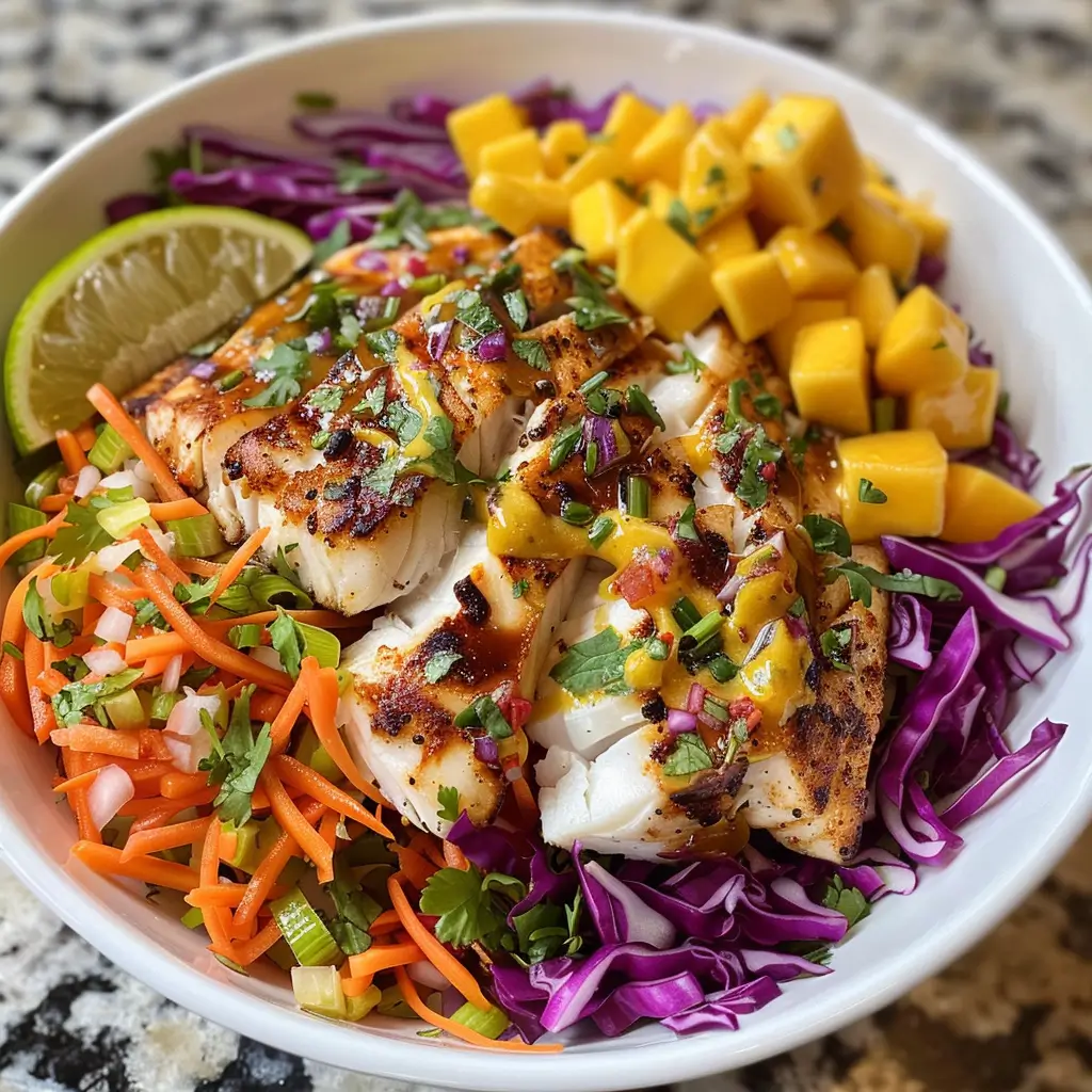 - Assemble bowls: layer slaw, top with fish, spoon mango salsa over, and drizzle with chipotle aioli. Serve immediately.