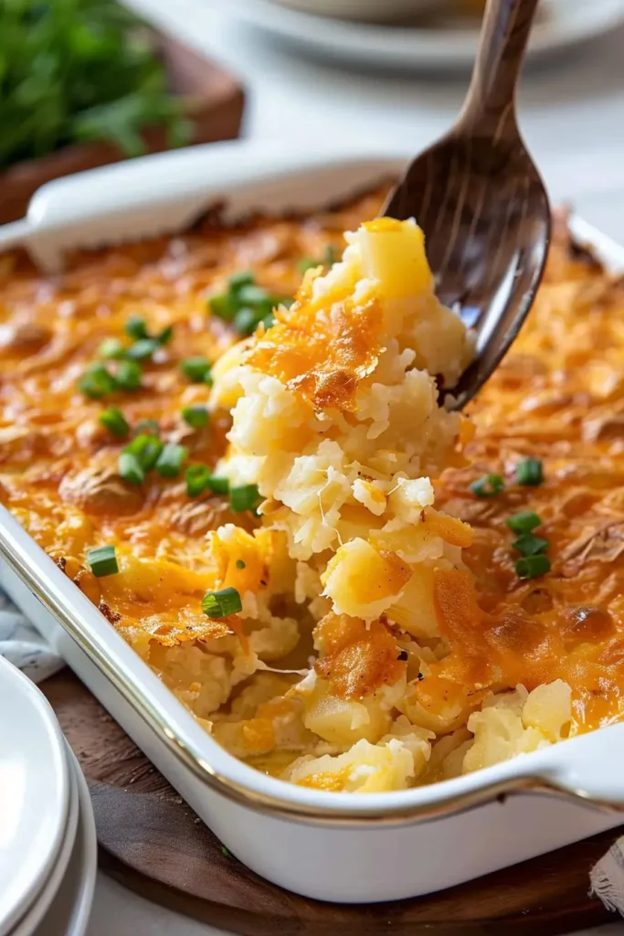 Cheesy, creamy potato casserole topped with crispy golden onions. Perfect for family dinners, potlucks, and holidays.