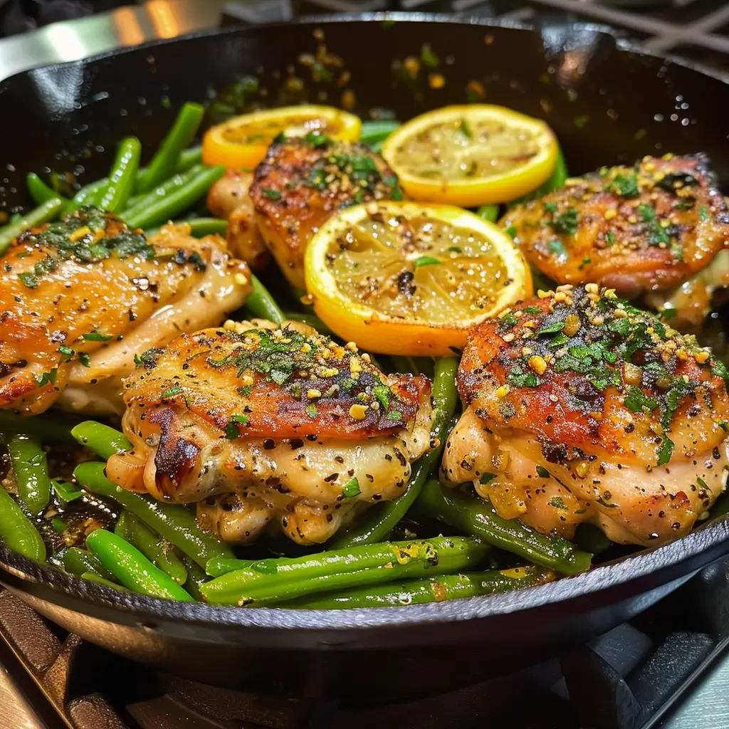 A flavorful, easy one-pan dinner featuring juicy chicken thighs, tender-crisp green beans, and a bright lemon garlic butter sauce. Perfect for weeknight meals.