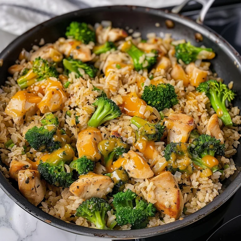 A comforting one-pan dinner featuring tender chicken, fluffy rice, fresh broccoli, and melted cheddar cheese. Perfect for busy weeknights with minimal cleanup and maximum flavor.