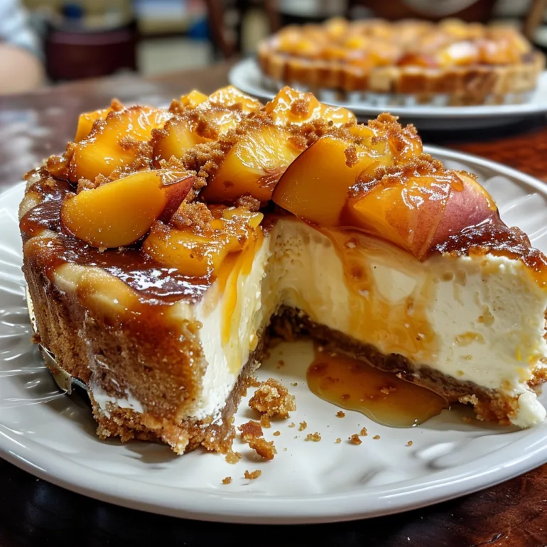 A stunning dessert combining creamy cheesecake with cinnamon-spiced peaches and a buttery cobbler topping on a graham cracker crust.