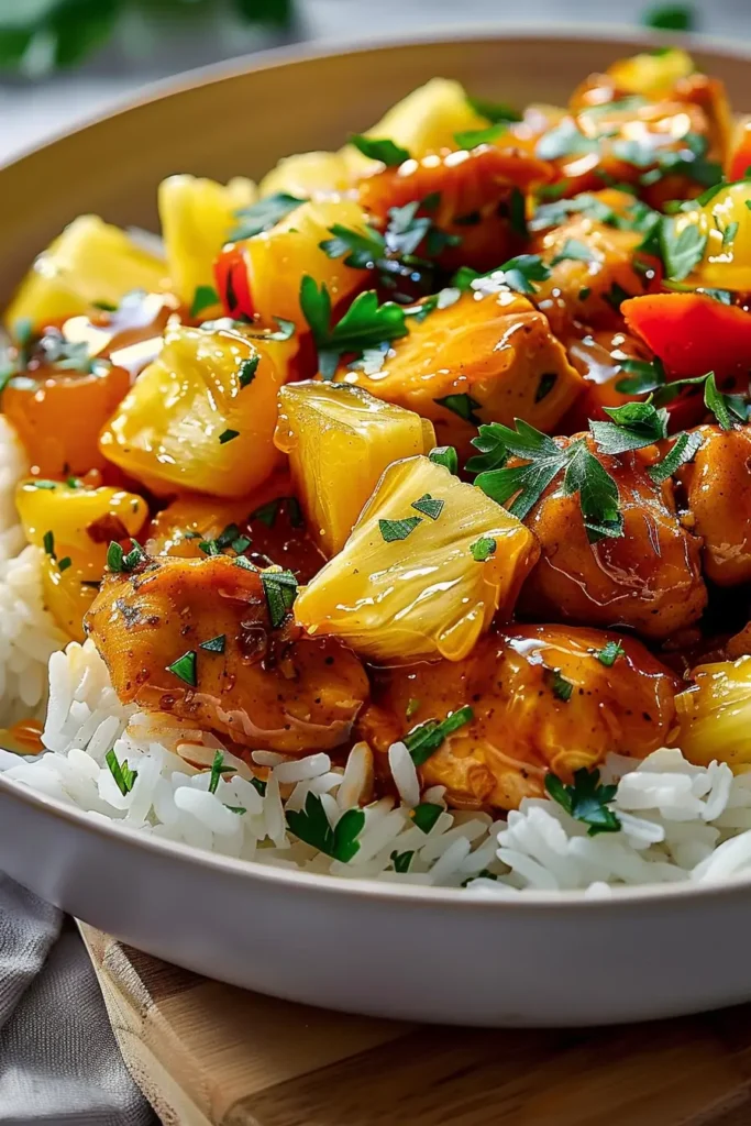 Tender chicken with sweet pineapple chunks served over fluffy rice. Quick, flavorful, and family-friendly, perfect for weeknights or gatherings.