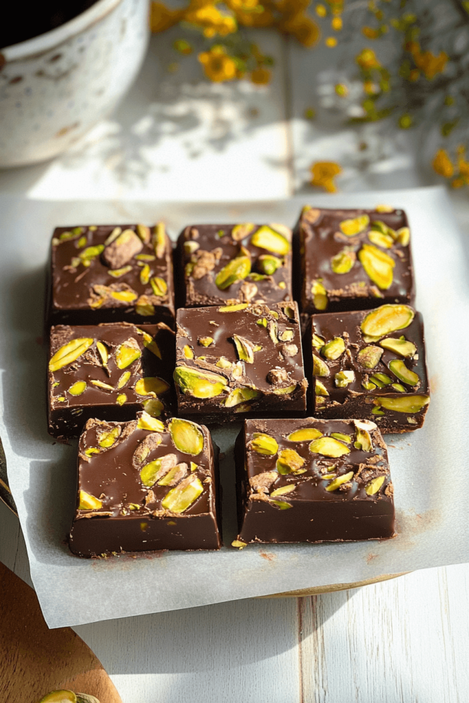 Pistachios aren’t just another nut—they’re a gourmet-level addition with unique flavor and texture. Roasted pistachios bring a savory crunch, mild sweetness, and a distinctive aroma that pairs beautifully with chocolate. They’re also visually striking, with their green and purple hues adding flair to every slice or square.