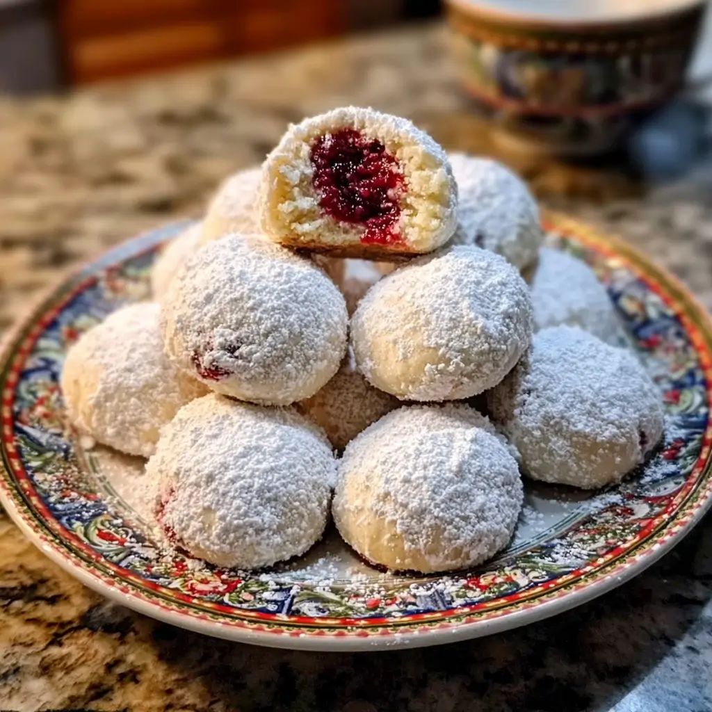 Soft, buttery almond cookies with a sweet-tart raspberry jam center, coated in powdered sugar for a melt-in-your-mouth, snowy finish. Perfect for holidays, gifting, or cozy afternoons.