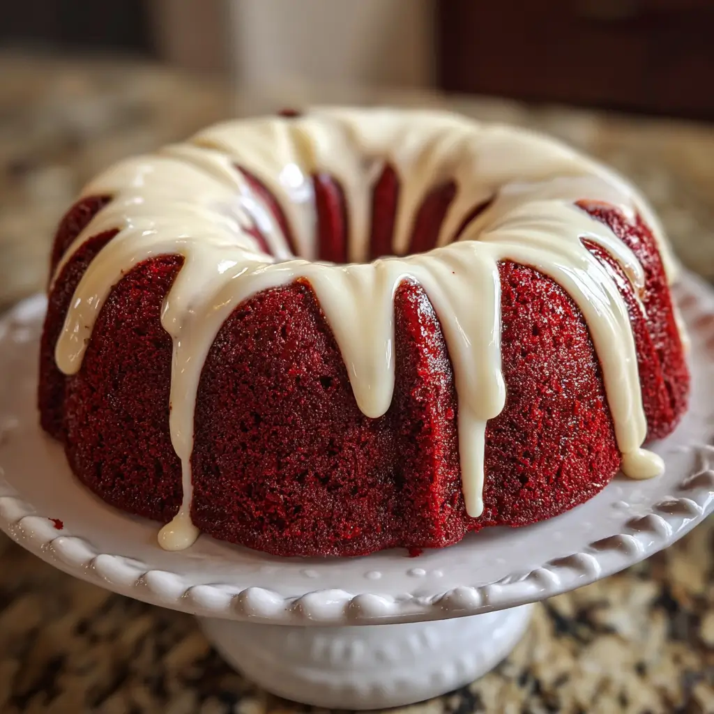 Place the cooled Bundt cake on a serving plate. Drizzle the glaze evenly over the top, letting it cascade down the sides for a beautiful effect. The contrast of red cake and white glaze makes this dessert visually stunning.
