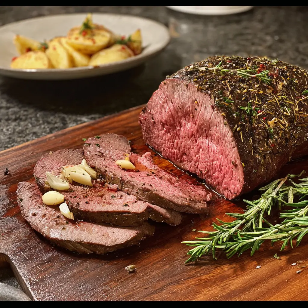 A tender, flavorful roast beef infused with fresh rosemary and garlic. Perfect for family dinners, holiday meals, or special occasions.