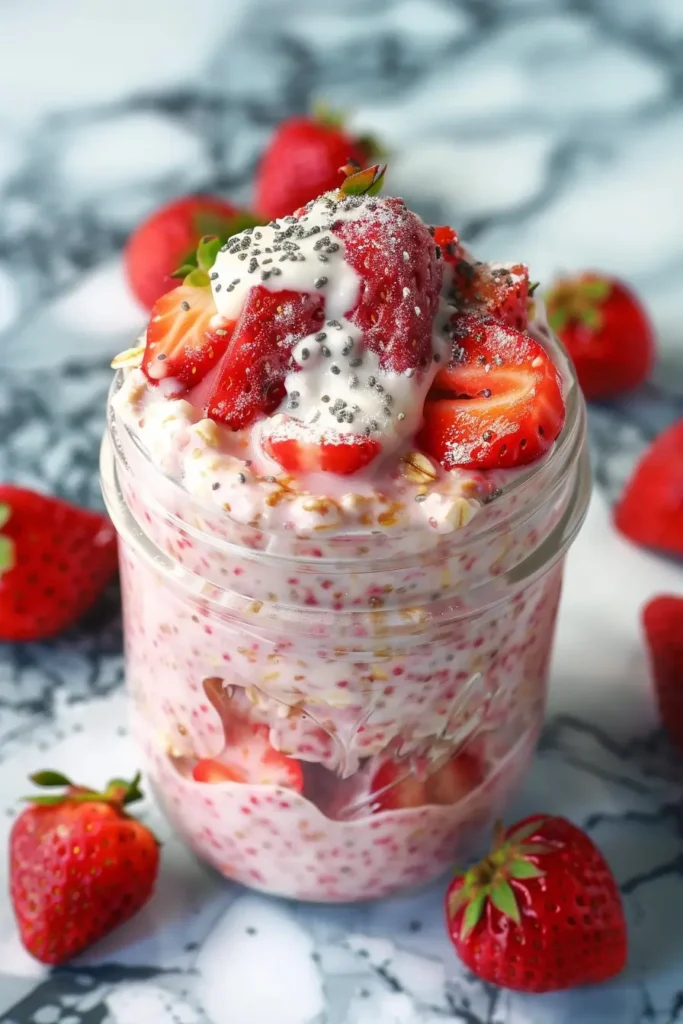 Strawberries and Cream Overnight Oats aren’t just tasty—they’re also a breakfast powerhouse. Rolled oats are rich in fiber, which supports healthy digestion and keeps you full until lunchtime. Greek yogurt adds protein to help energize your morning, while strawberries provide a burst of vitamins, particularly vitamin C, antioxidants, and natural sweetness without added sugar. Chia seeds, if included, contribute omega-3 fatty acids and extra fiber, making this dish even more nutritious. A drizzle of honey or maple syrup adds gentle sweetness, balancing flavor without overloading calories.