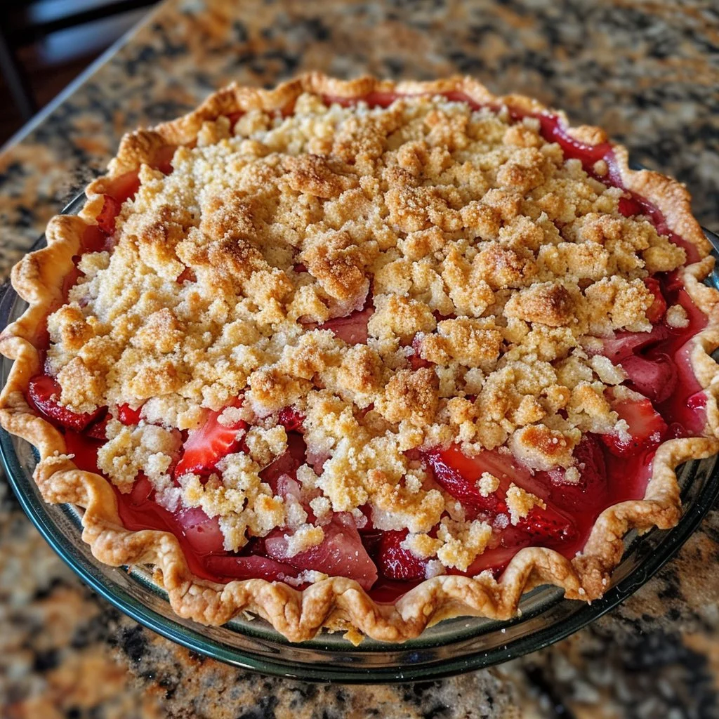 A delightful strawberry rhubarb pie with a crumb topping, perfect for any occasion.