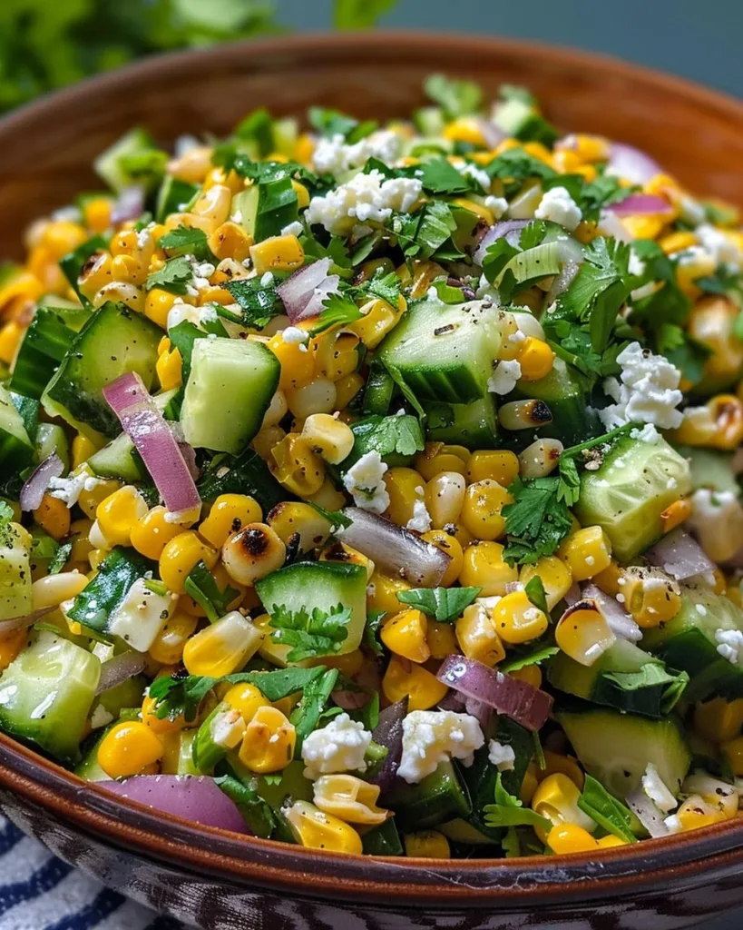 A vibrant and fresh take on traditional street corn, this salad combines sweet corn, crisp cucumbers, and a tantalizing blend of spices, perfect for summer days and barbecues.
